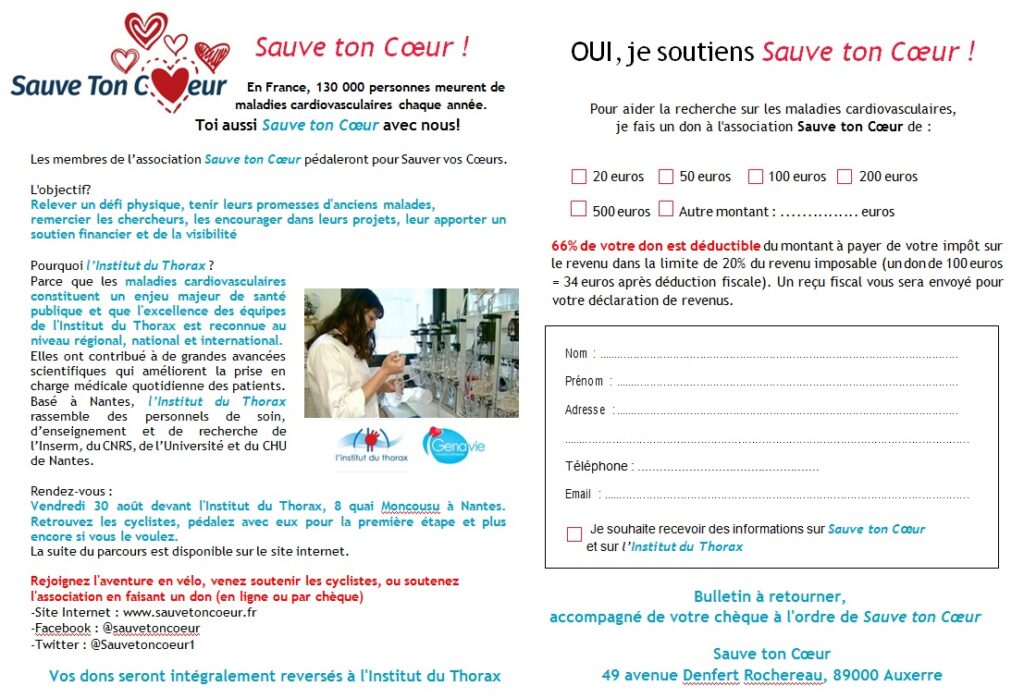 2°) envoyer un chèque accompagné du formulaire de dons (bouton droit sur l’image => enregistrer, puis imprimer le formulaire depuis votre ordinateur) à : Trésorière de l’association sauve ton coeur, 49 avenue denfert Rochereau 89000 Auxerre – n’oubliez pas de joindre les informations nécessaires pour l’envoi des documents pour la défiscalisation)